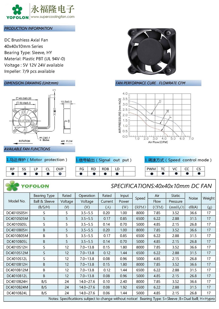 DC Fan 40x40x10mm 7 blade Series Product No.:2024815122054 Size:40x40x10mm Material:PBT UL 94V-0 Bearing Type:Sleeve, Dual Ball, Hydraulic Rated Voltage:5V,12V,24V Rated Current:0.05A~0.22A Fan Speed:5000~10000RPM Air Flow:4.85~8.65CFM Noise:26.8~39.5dBA Operation Temperature:-20° C~80° C Output Function:FG,RD,PWM,Waterproof Available Online Inquiry Details Previous Product:DC Fan 40x40x20mm Series Next Product:DC Fan 40x40x10mm Series Related Products DC Fan 150x150x50mm Series DC Fan 25x25x7mm Series DC Fan 120x120x38mm Pressurize Series