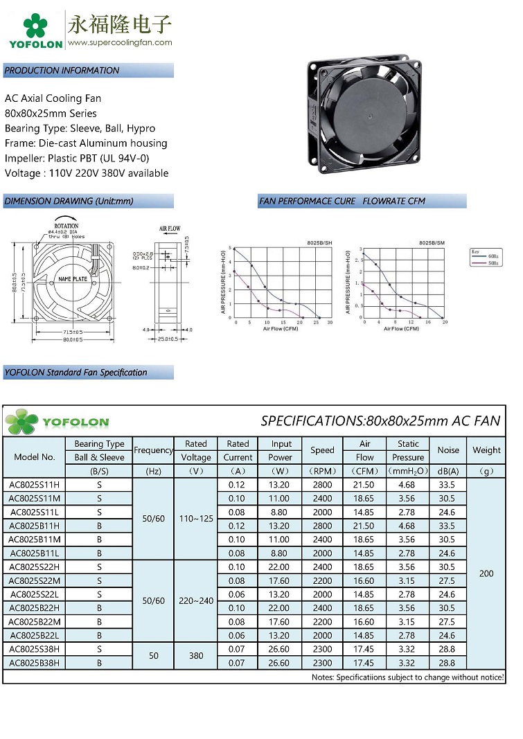 AC Fan 80x80x25mm Series Product No.:20248151577 Size:80x80x25mm Material:Aluminum allloy and PBT UL 94V-0 Bearing Type:Sleeve, Dual Ball, Hydraulic Rated Voltage:110V,220V,380V Rated Current:0.07A~0.12A Fan Speed:2000~2800RPM Air Flow:14.85~21.50CFM Noise:24.6~33.5dBA Operation Temperature:-20° C~80° C Output Function:FG,RD,PWM,Waterproof Available Online Inquiry Details Previous Product:AC Fan 92x92x25mm Series Related Products AC Fan 200x200x60mm Series AC Fan 220x220x60mm Series AC Fan 92x92x25mm Series