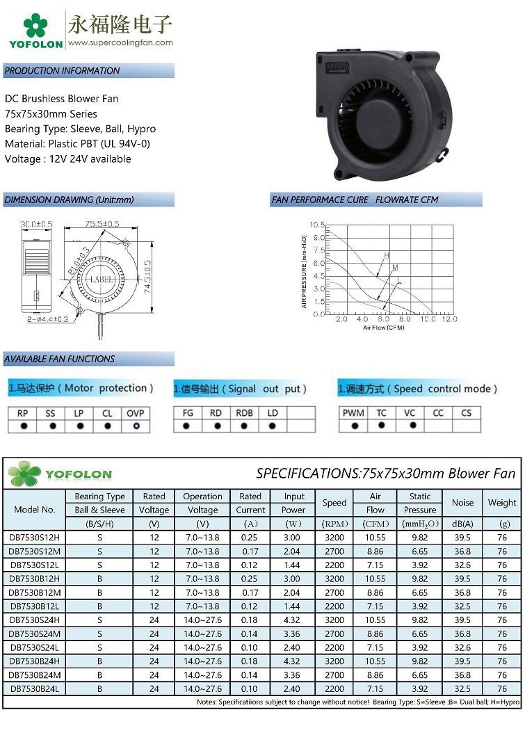 DC Blower Fan 75x75x30mm Series Product No.:202481614581 Size:75x75x30mm Material:PBT UL 94V-0 Bearing Type:Sleeve, Dual Ball, Hydraulic Rated Voltage:12V,24V Rated Current:0.10A~0.25A Fan Speed:2200~3500RPM Air Flow:7.15~11.45CFM Noise:36.2~48.5dBA Operation Temperature:-20° C~80° C Output Function:FG,RD,PWM,Waterproof Available Online Inquiry Details Previous Product:DC Blower Fan 60x60x25mm Series Next Product:DC Blower Fan 97x94x33mm Series Related Products DC Blower Fan 75x75x25mm Series DC Blower Fan 60x60x15mm Series DC Blower Fan 75x75x15mm Series