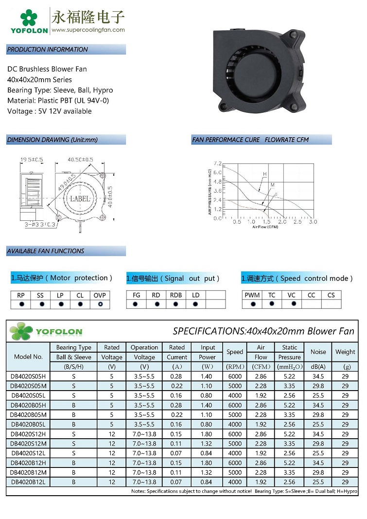 DC Blower Fan 40x40x20mm Series Product No.:2024816172512 Size:40x40x20mm Material:PBT UL 94V-0 Bearing Type:Sleeve, Dual Ball, Hydraulic Rated Voltage:5V,12V,24V Rated Current:0.07A~0.28A Fan Speed:4000~6000RPM Air Flow:1.92~2.86CFM Noise:25.5~34.5dBA Operation Temperature:-20° C~80° C Output Function:FG,RD,PWM,Waterproof Available Online Inquiry Details Previous Product:DC Blower Fan 40x40x15mm Series Next Product:DC Blower Fan 50x50x10mm Series Related Products DC Blower Fan 75x75x25mm Series DC Blower Fan 60x60x15mm Series DC Blower Fan 75x75x15mm Series