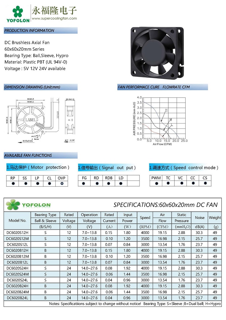 DC Fan 60x60x20mm Series Product No.:2024826172829 Size:60x60x20mm Material:PBT UL 94V-0 Bearing Type:Sleeve, Dual Ball, Hydraulic Rated Voltage:5V,12V,24V Rated Current:0.04A~0.15A Fan Speed:3000~4000RPM Air Flow:13.54~19.15CFM Noise:25.5~30.5dBA Operation Temperature:-20° C~80° C Output Function:FG,RD,PWM,Waterproof Available Online Inquiry Details Previous Product:DC Fan 60x60x25mm Series Next Product:DC Fan 60x60x15mm Series Related Products DC Fan 150x150x50mm Series DC Fan 25x25x7mm Series DC Fan 120x120x38mm Pressurize Series