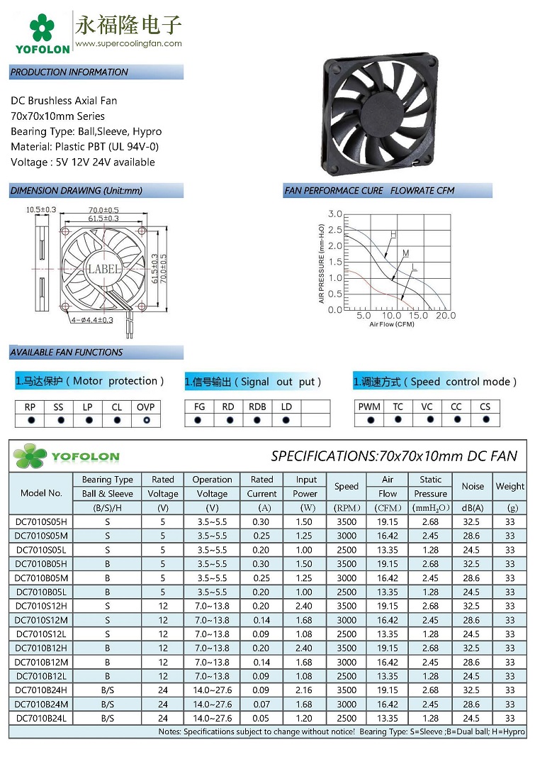 DC Fan 70x70x10mm Series Product No.:202482618223 Size:70x70x10mm Material:PBT UL 94V-0 Bearing Type:Sleeve, Dual Ball, Hydraulic Rated Voltage:5V,12V,24V Rated Current:0.05A~0.30A Fan Speed:2500~3500RPM Air Flow:13.35~19.15CFM Noise:24.5~32.5dBA Operation Temperature:-20° C~80° C Output Function:FG,RD,PWM,Waterproof Available Online Inquiry Details Previous Product:DC Fan 70x70x15mm Series Next Product:DC Fan 60x60x25mm Series Related Products DC Fan 150x150x50mm Series DC Fan 25x25x7mm Series DC Fan 120x120x38mm Pressurize Series