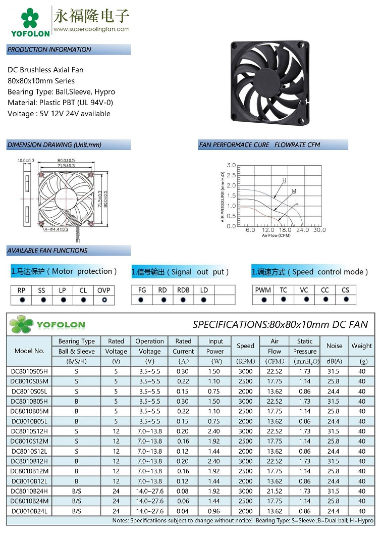 DC Fan 80x80x10mm Series Product No.:202482711625 Size:80x80x10mm Material:PBT UL 94V-0 Bearing Type:Sleeve, Dual Ball, Hydraulic Rated Voltage:5V,12V,24V Rated Current:0.04A~0.30A Fan Speed:2000~3000RPM Air Flow:13.62~22.52CFM Noise:24.4~31.5dBA Operation Temperature:-20° C~80° C Output Function:FG,RD,PWM,Waterproof Available Online Inquiry Details Previous Product:DC Fan 80x80x15mm Series Next Product:DC Fan 70x70x25mm Series Related Products DC Fan 150x150x50mm Series DC Fan 25x25x7mm Series DC Fan 120x120x38mm Pressurize Series
