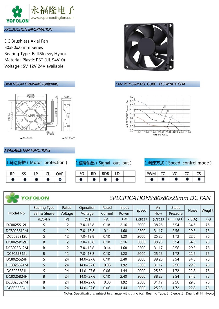 DC Fan 80x80x25mm Series Product No.:2024827114154 Size:80x80x25mm Material:PBT UL 94V-0 Bearing Type:Sleeve, Dual Ball, Hydraulic Rated Voltage:12V,24V Rated Current:0.06A~0.18A Fan Speed:2000~3000RPM Air Flow:13.62~22.52CFM Noise:25.25~38.25dBA Operation Temperature:-20° C~80° C Output Function:FG,RD,PWM,Waterproof Available Online Inquiry Details Previous Product:DC Fan 80x80x25mm Series Next Product:DC Fan 80x80x20mm Series Related Products DC Fan 150x150x50mm Series DC Fan 25x25x7mm Series DC Fan 120x120x38mm Pressurize Series