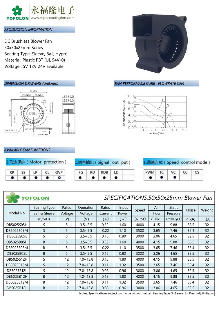 DC Blower Fan 50x50x25mm Series Product No.:202493154221 Size:50x50x25mm Material:PBT UL 94V-0 Bearing Type:Sleeve, Dual Ball, Hydraulic Rated Voltage:5V,12V,24V Rated Current:0.08A~0.32A Fan Speed:3000~4000RPM Air Flow:3.06~4.15CFM Noise:32.5~38.5dBA Operation Temperature:-20° C~80° C Output Function:FG,RD,PWM,Waterproof Available Online Inquiry Details Previous Product:DC Blower Fan 50x50x20mm Series Next Product:DC Blower Fan 75x75x15mm Series Related Products DC Blower Fan 75x75x25mm Series DC Blower Fan 60x60x15mm Series DC Blower Fan 75x75x15mm Series